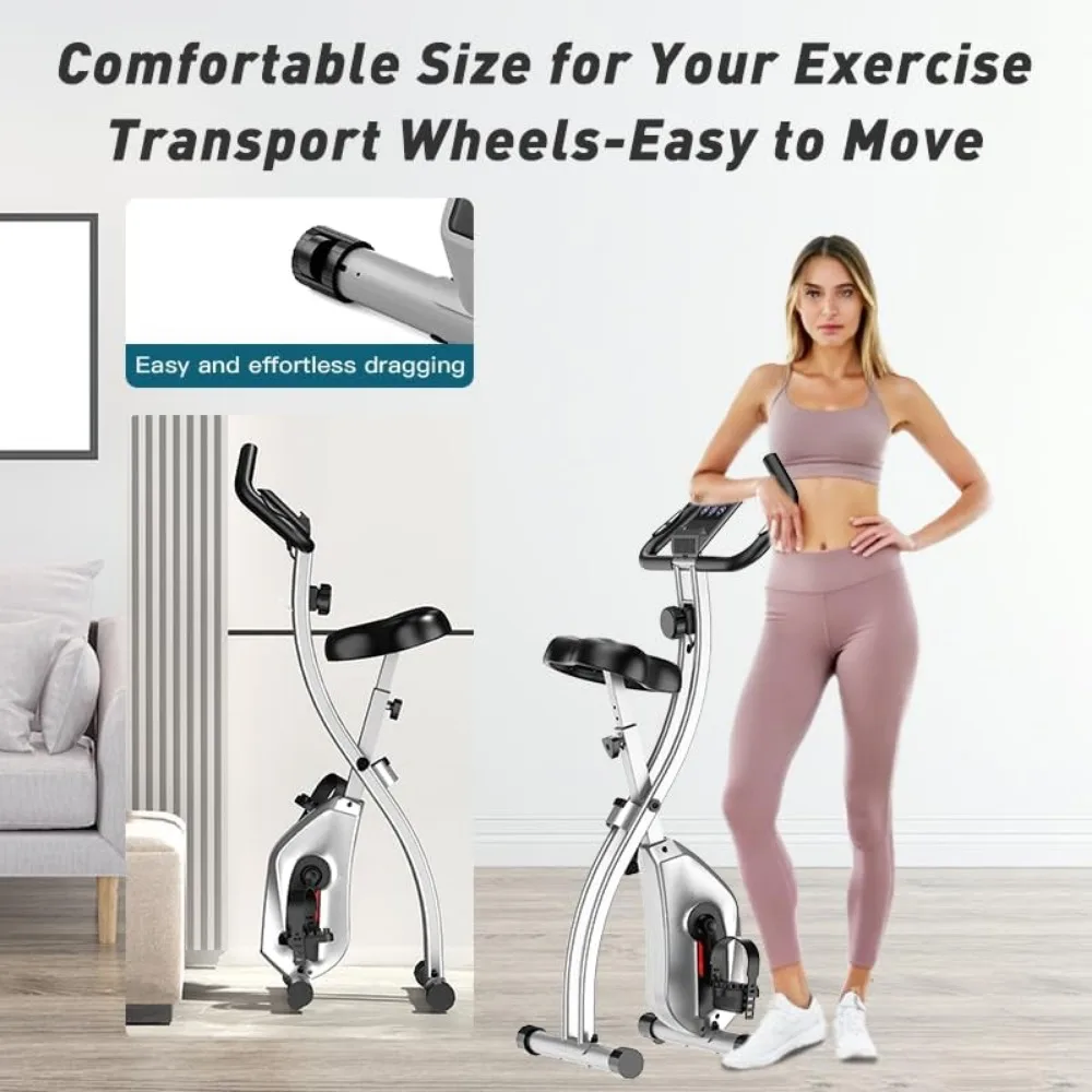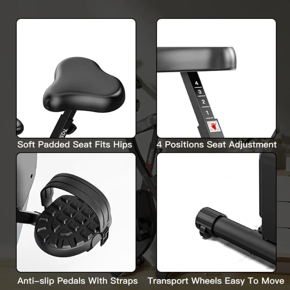 - Save 80% of Space: Our CRYSTAL FIT folding exercise bike allows you to easily store it in a compact space. When the CRYSTAL FIT workout bike is not in use, it can be folded to only 13" x 7 x 21" and can be moved using the included transport wheels.